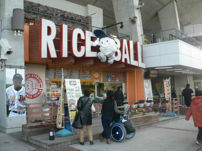 内野側のスロープを上がると目の前にRICE BALLの看板が見えてくる。 その風貌は正にアメリカチックで、東京Sのボールのオバケとジャイアンツのボールのオバケを足して2で割ったような感じである。
