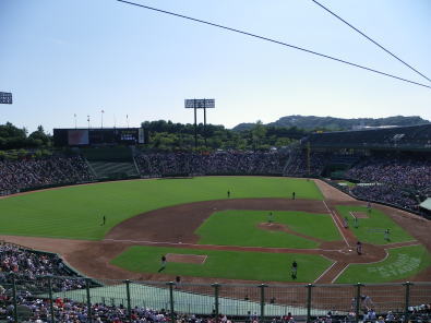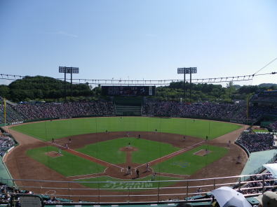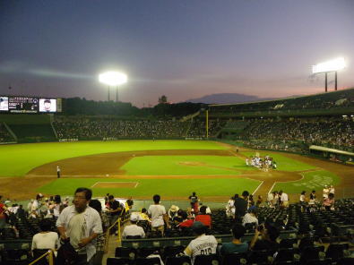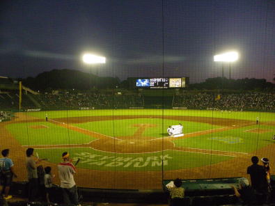 | ネット裏指定席から見たグラウンドと座席の様子。内野自由席と大して変わらんぞ!しかし傾斜が緩やかで観戦には最高の環境である。その球場運営能力には脱帽だ。 |