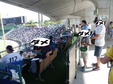 妙にグラウンド部分に突き出しているのがお判りいただけるだろう。だが、選手との距離が近いということだけで7,000円。まあウリがそれなので仕方ないが、宮城でもフェンスを取り外せば、同じぐらいのことは出来る。それで3,000円なのだからどれだけプライマリーがあるんだといいたくなるが、まあ日本初のフィールドシートであること、サインのチャンスが極めて高いので、サインにお金を払ったと思って見てもらったほうが良いだろう。なお試合終了後にサインをもらえる可能性は極めて低い。開場と同時、どんなに遅くても試合開始45分前に球場に入れない人は7,000円払ってココで試合を見るのはオススメしない。まあそれでも良いなら結構ですけど・・・