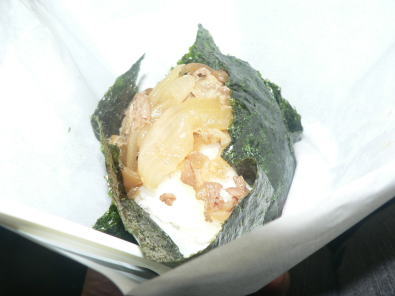 内野限定です。スロープを挙がってすぐの所にあるボールのオバケ看板の店の商品です。砲丸ぐらいの握り飯の中にから揚げと牛丼が入っているおにぎり。チキンハートのダメ投手陣と豪打の野手陣というイメージなのでしょうか?炊き立てなのでそれはポイント高いですが、幼児や女の子が食べられるサイズじゃないかも・・・ |